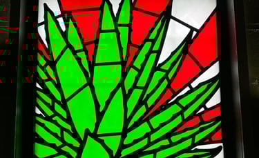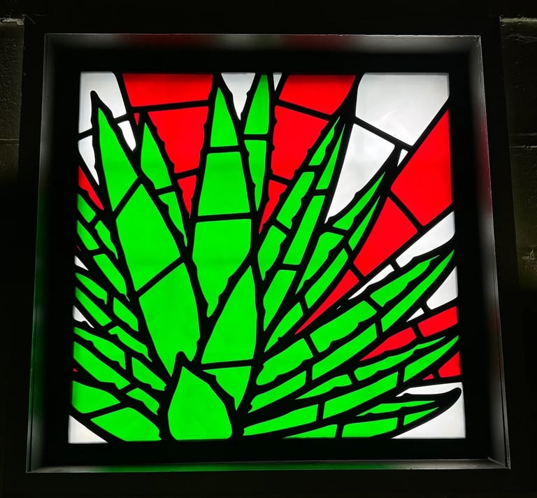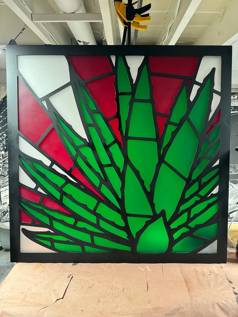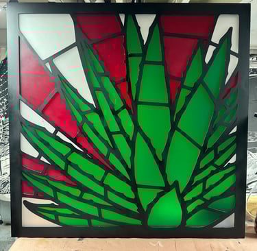 This is a custom project I created for Salud Eleven, a Mexican restaurant in Oak Park Michigan. The owner was looking for some type of window art. I figured that we should somehow utilize the light coming through the window, and create some type of stained glass looking artwork, combining wood and colored acrylic. We settled on an agave plants as the subject matter.